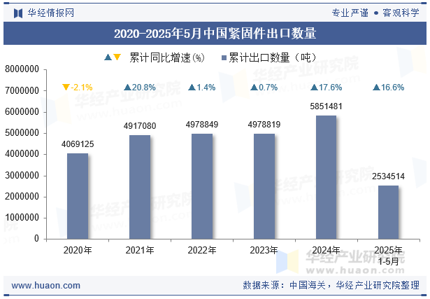 華經(jīng)產(chǎn)業(yè)研究院數(shù)據(jù)顯示:2025年1-5月中國緊固件出口數(shù)量為2534514噸,相比上年同期增長了354805噸,同比增長16.6%;出口金額為488485萬美元,相比上年同期增長了40383.6萬美元,同比增長9.3%。2025年5月中國緊固件出口數(shù)量為567246噸;出口金額為108448.6萬美元。