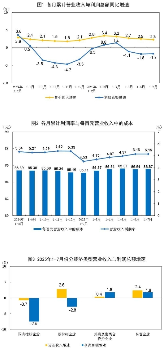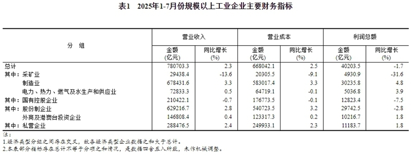 1—7月份,全國規(guī)模以上工業(yè)企業(yè)實現(xiàn)利潤總額40203.5億元,同比下降1.7%(按可比口徑計算,詳見附注二)。